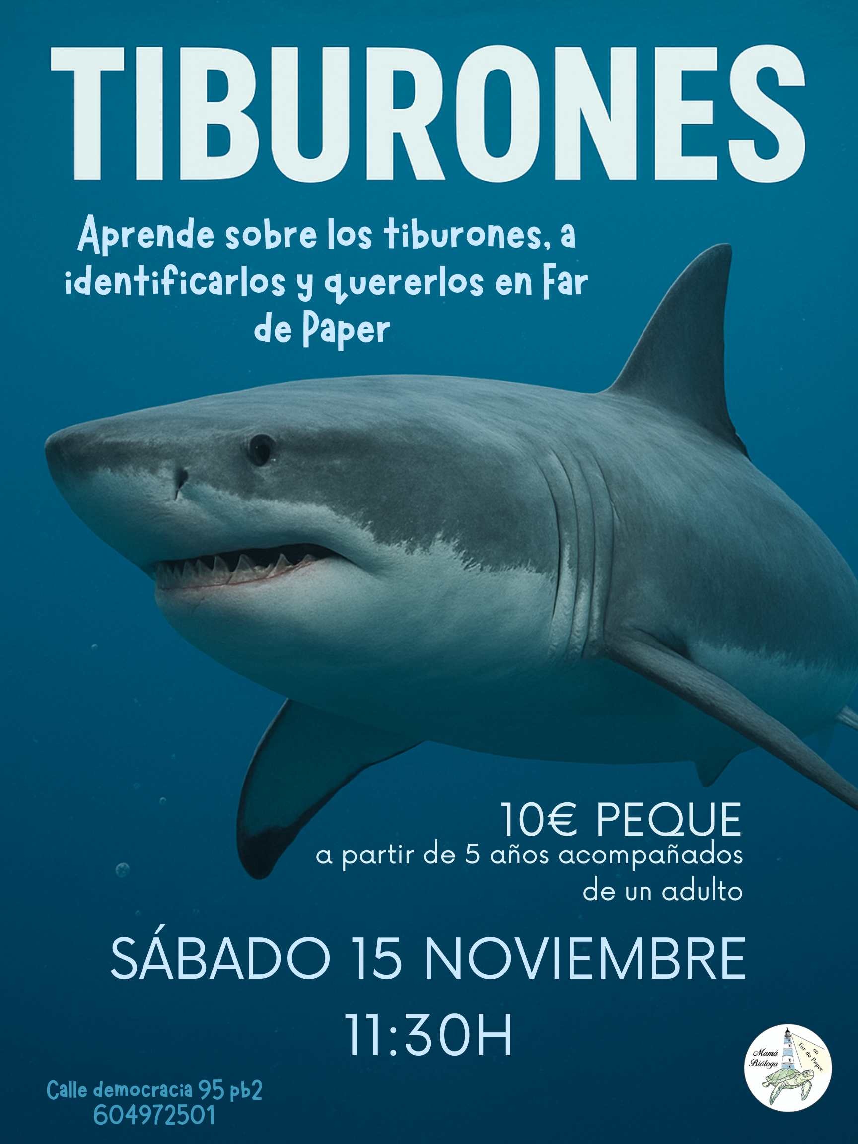 Aprende sobre los tiburones, a identificarlos y quererlos en Far de Pape.  El sábado 15 de Noviembre a las 11:30h en Calle Democracia 95 pb2, valencia.